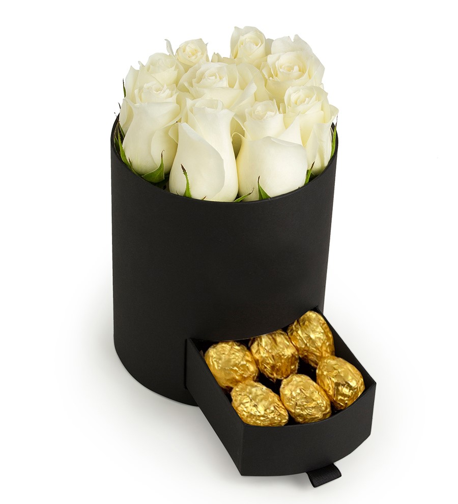 Yuvarlak Küçük Siyah Kutuda Çikolatalı Beyaz Gül