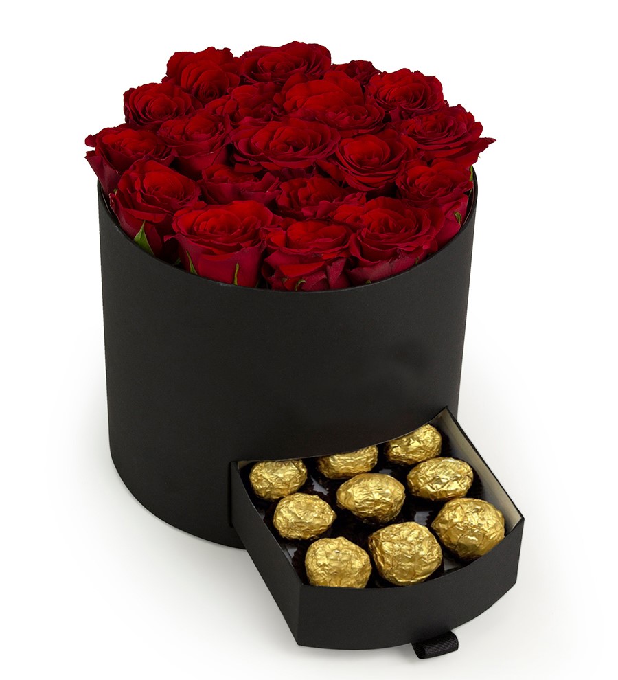 Kalpli Siyah Kutuda Gold Çikolatalı Kırmızı Gül