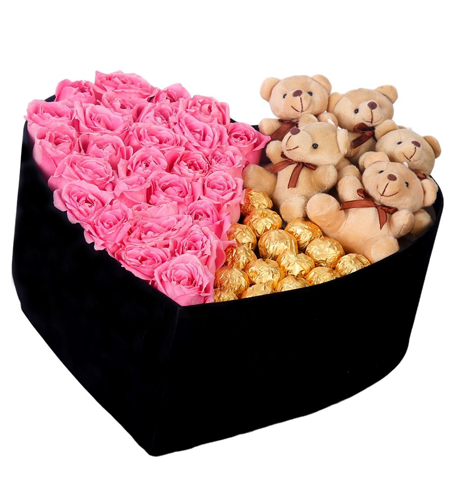 Kutuda Çikolatalı Ayıcıklı Pembe Gül