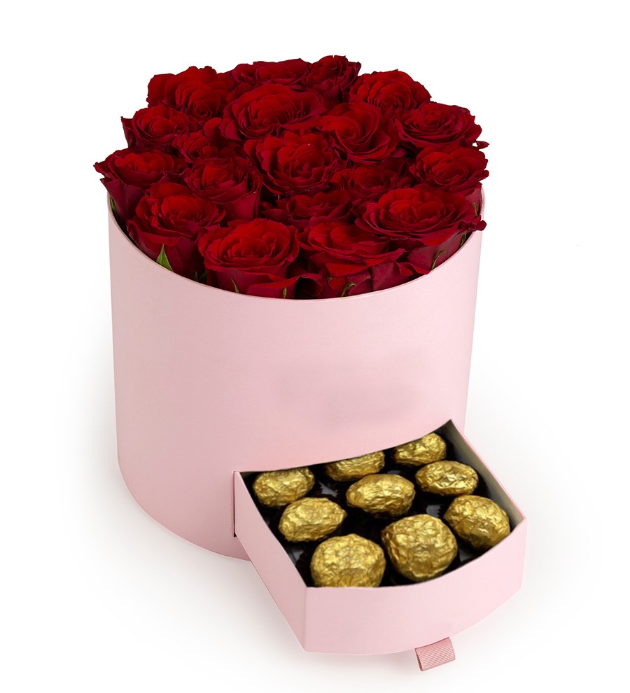 Pembe Kutuda Çikolatalı Kırmızı Gül