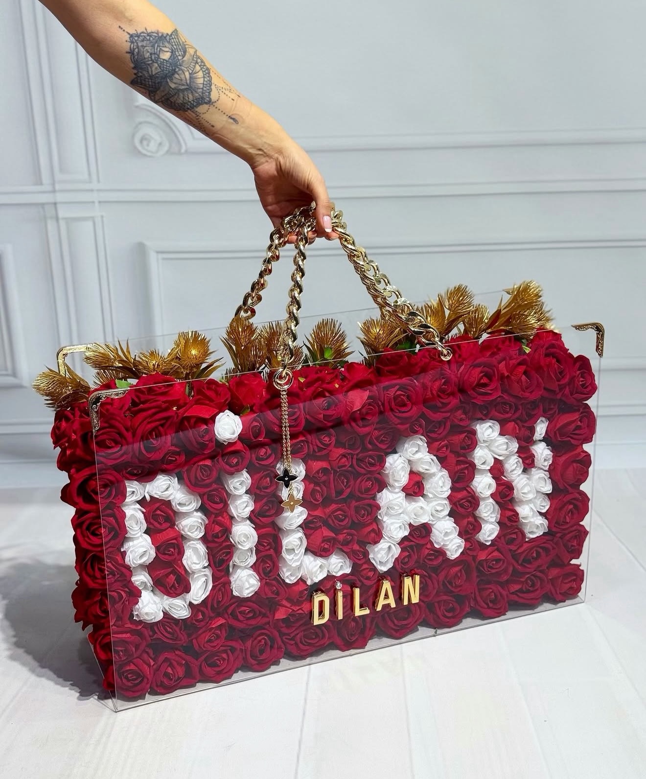 Bilgi: Tasarım çiçek kategorisindeki ürünlerin üzerine yazılacak olan isim ve harf düzenlemeleri, sipariş formundaki "Alıcı Adı" bilgisine göre kişiye özel olarak düzenlenecektir.